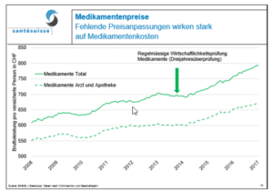 «Medikamente: hohe Mehrkosten wegen fehlender Preisüberprüfung. Das BAG hat die regelmässige Preisüberprüfung der Medikamente nach einem dreijährigen Unterbruch erst per Ende 2017 wieder aufgenommen. Die fehlende Preisüberprüfung schlug sich im Anstieg der Medikamentenkosten pro Kopf um 4,6 Prozent (Vorjahr +5,4 Prozent) nieder. Dank der regelmässigen Überprüfung der Medikamente, die in den Jahren 2013 bis 2015 vorgenommen wurde, blieben diese Ausgaben konstant. Danach war wiederum ein starker Anstieg zu verzeichnen.»