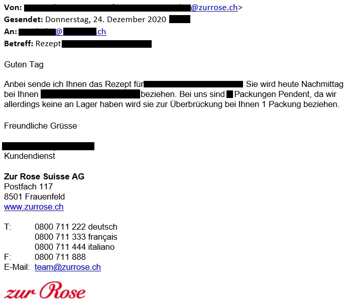 Aha, es geht dem Unternehmer nur um die Digitalisierung und um eine bessere Zugänglichkeit. Wo ist dann die bessere Zugänglichkeit? Wenn die «Zur Rose», just am 24. Dezember, folgendes E-Mail an eine lokale Quartierapotheke einer Kundin sendet: