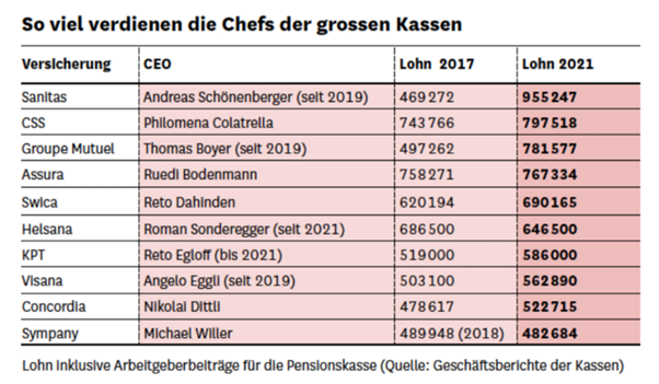 Bei der Sanitas beispielsweise gab es in den letzten fünf Jahren für den CEO einen Lohnsprung von fast 500’000 Franken. Dieser Lohnanstieg entspricht 104 Prozent! Damit verdient Herr Schönenberger jährlich satte 950’000 Franken. Aber auch die Chefs der anderen grossen Kassen haben ansehnliche Löhne, praktisch alle bewegen sich über der 500’000 Franken Jahressalär Marke.