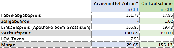 Die Marge auf den On Turnschuhen ist also Faktor 5.23 höher als jene des Arzneimittels Zofran®!