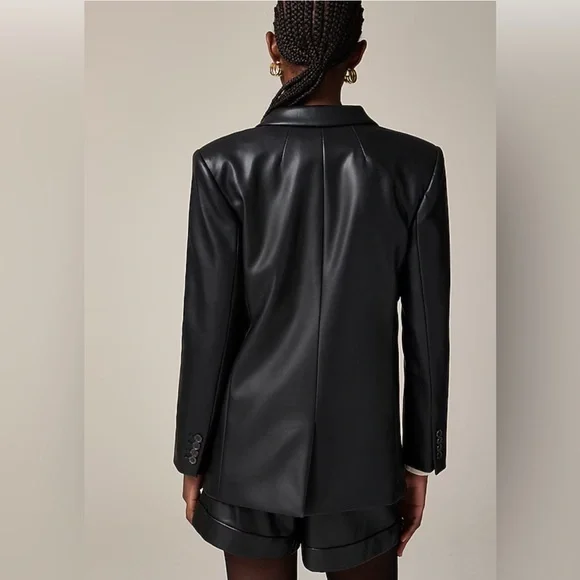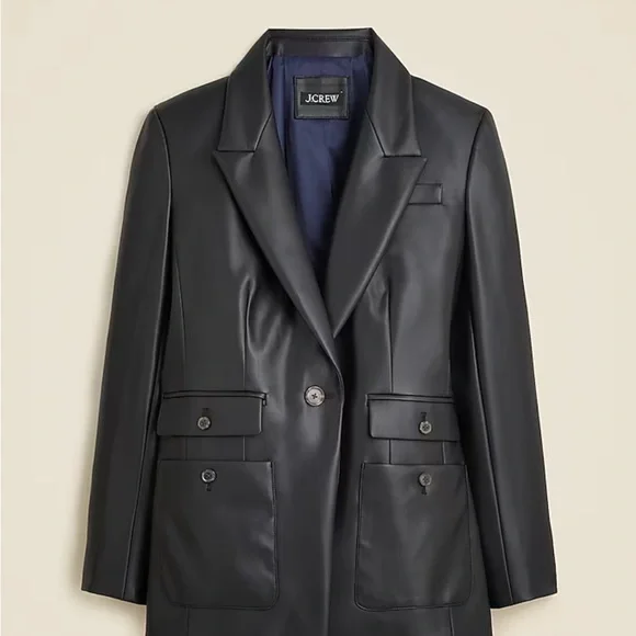 NWT JCrew Vivienne blazer in faux leatherAuthentic Brand new No defects Quantity available (1) See photoss for r s t item details Size: (0) Details: -This thoughtfully designed silhouette comes with extra pocket details at the front, a sleek, straight fit and a single button closure at the waist. Plus, it's crafted in supersmooth faux leather made with LENZING™ ECOVERO™ Viscose that's sourced from responsibly managed forests and produced with less water and lower emissions.100% LENZING™ ECOVERO™ Viscose.Notch lapel.Single-breasted.Long sleeves.Patch pockets.Lined.Dry clean.Imported.Classic fit.Body length: 28 1/2".Sleeve length: 32 1/4".Hits at hip.✅No returns✅ No exchanges No buyers remorse No Low ball offers No returns on beauty, hygiene or fragrances no exceptions! ✅Taxes included ✅And We waive all liability off all purchases once in the possession of all mail carriers. Thank you for shopping here.