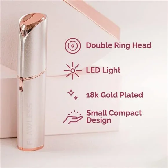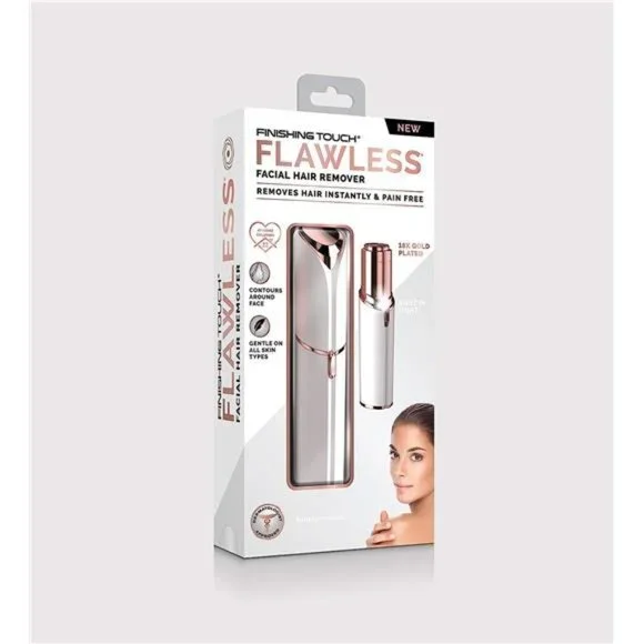 🧿One Finishing Touch Flawless Facial Hair Remover, White/Rose Gold stainless steel bladed hair remover for women features 18 karat gold plating and LED light for precision🧿Use the face hair trimmer to instantly remove peach fuzz and hair from lips, chin, neck and cheeks or use as an eyebrow shaper to maintain flawless brows between, or instead of, waxing and plucking🧿Hypoallergenic and dermatologist recommended, this electric face razor allows anyone to painlessly remove unwanted hair by simply pressing to the face and making small circular motions, leaving skin smooth and hair-free🧿Made with 18 karat gold and shaped like a tube of lipstick for discreet hair removal anywhere, this womens electric razor utilizes revolutionary Butterfly Technology that removes hair by microscopically paring it down by a spinning head covered by a plate🧿Flawless facial hair removal device is gentle enough to use everyday before putting on makeup, no need to wait for regrowth, so you can enjoy hairless skin everyday without nicks, bumps or razor burn Finishing Touch Flawless Women's painless hair remover. Remove flawless cap, slide the switch located on the side of the unit upward into the "on" Position. The light will automatically turn on when the unit is "on". Gently press the head of the unit flat against your skin. The unit should not be on an angle. Precede making small circular motions to remove unwanted hair. Note: it is normal for the head to become warm with use.