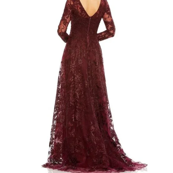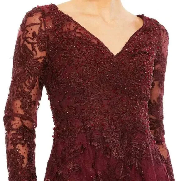 DESIGNER: MAC DUGGALSIZE: 18CONDITION:NEW WITH TAGSORIGINALLY $798.00!!!In this elegantly appointed A-line gown, a wine-soaked hue is scattered in starlight and tumbled in intricately embroidered blooms.V-neckLong sleevesLined, except sleeves100% polyesterThe manuf tag is missing..the dept store tag is attached