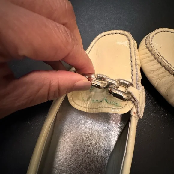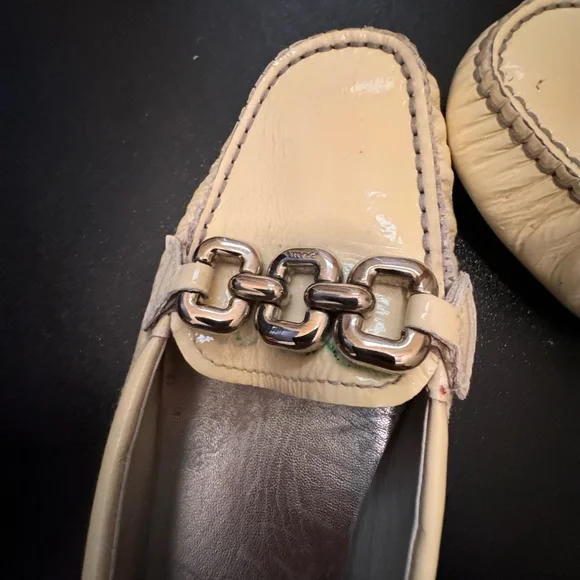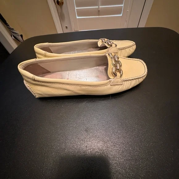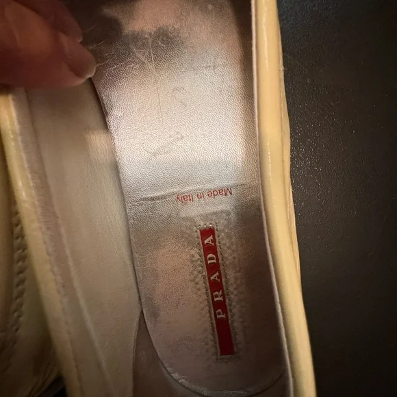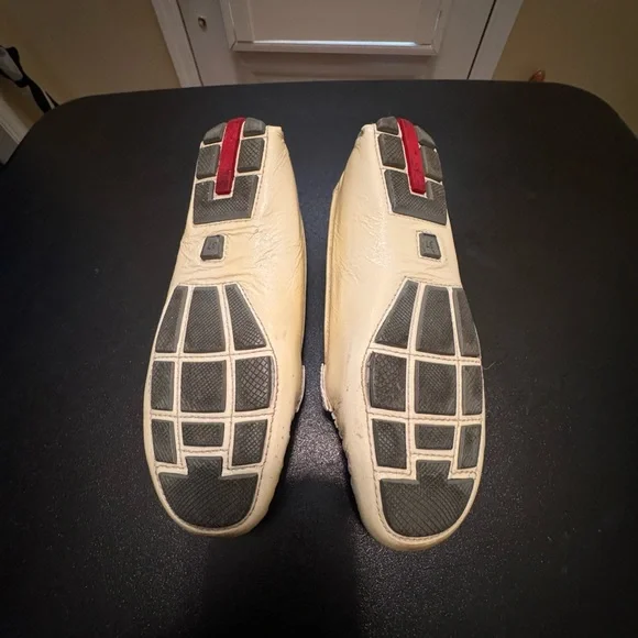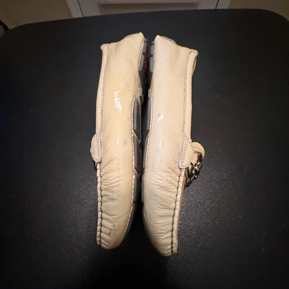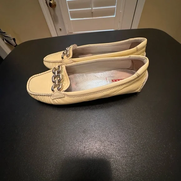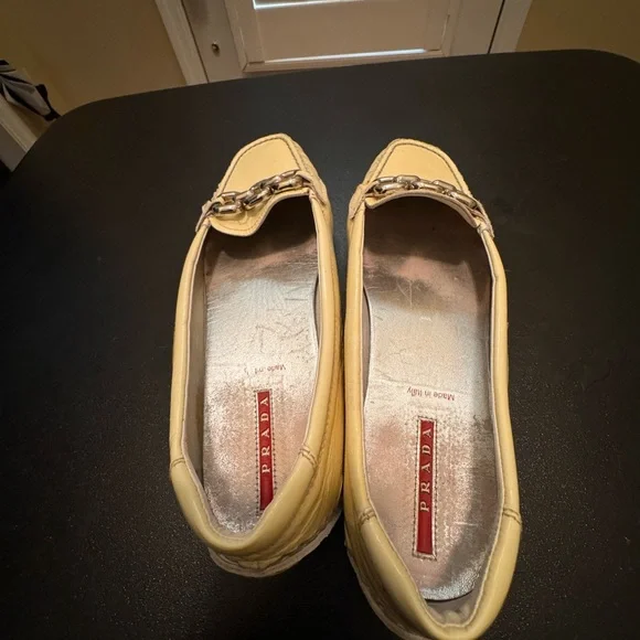 Prada made in ItalyEUR 37 light yellow driving loafer flats shoes minor signs of wear note photosmost notable under silver metail staining not noticable when wearing shoe note photositem 2189