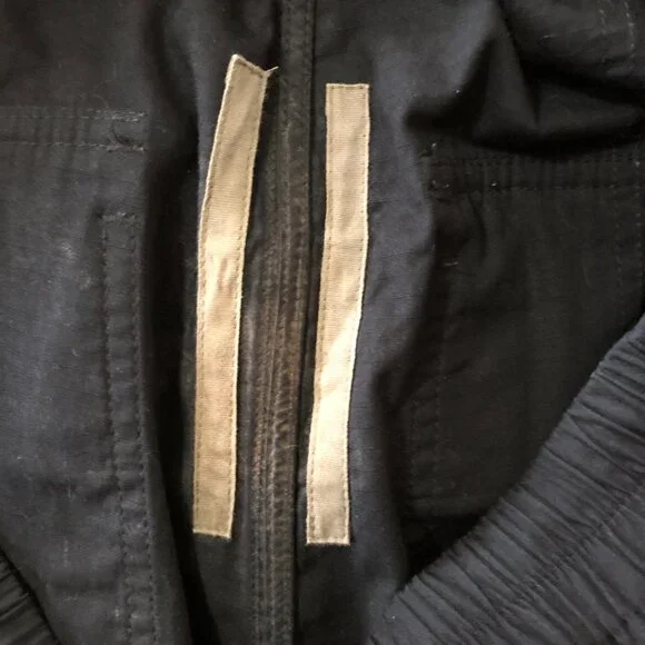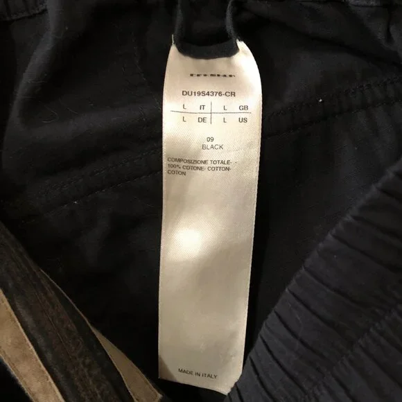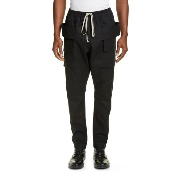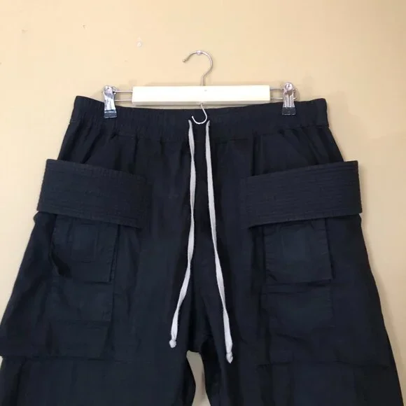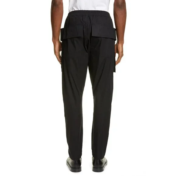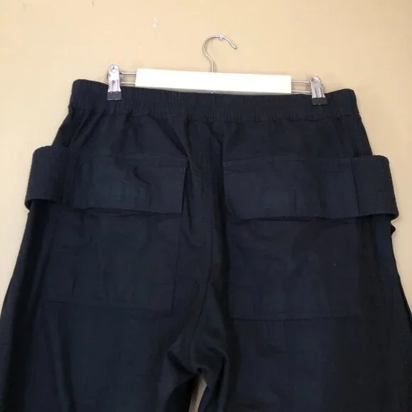 Matelassé straps wrap from the layered front pockets to the back patch pockets of modern cargo pants that pair an elastic waist with neatly stitched hems. Elastic/drawstring waist. Layered slant and cargo pockets; back flap-patch pockets. 100% cotton. Dry clean or hand wash, line dry. Great, gently worn condition.Size: LWaist: stretches from 32"-40" (measured flat then doubled)Rise: 13.5"Inseam: 32.5"g2