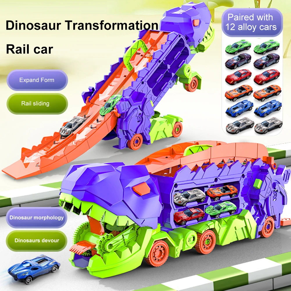 Dinosaur Toys Transforms Into Stomping Dinosaur with Race Track Dinosaur Transporter Truck Gifts for Kids Ages 3 4 5 6 Years Old Feature: